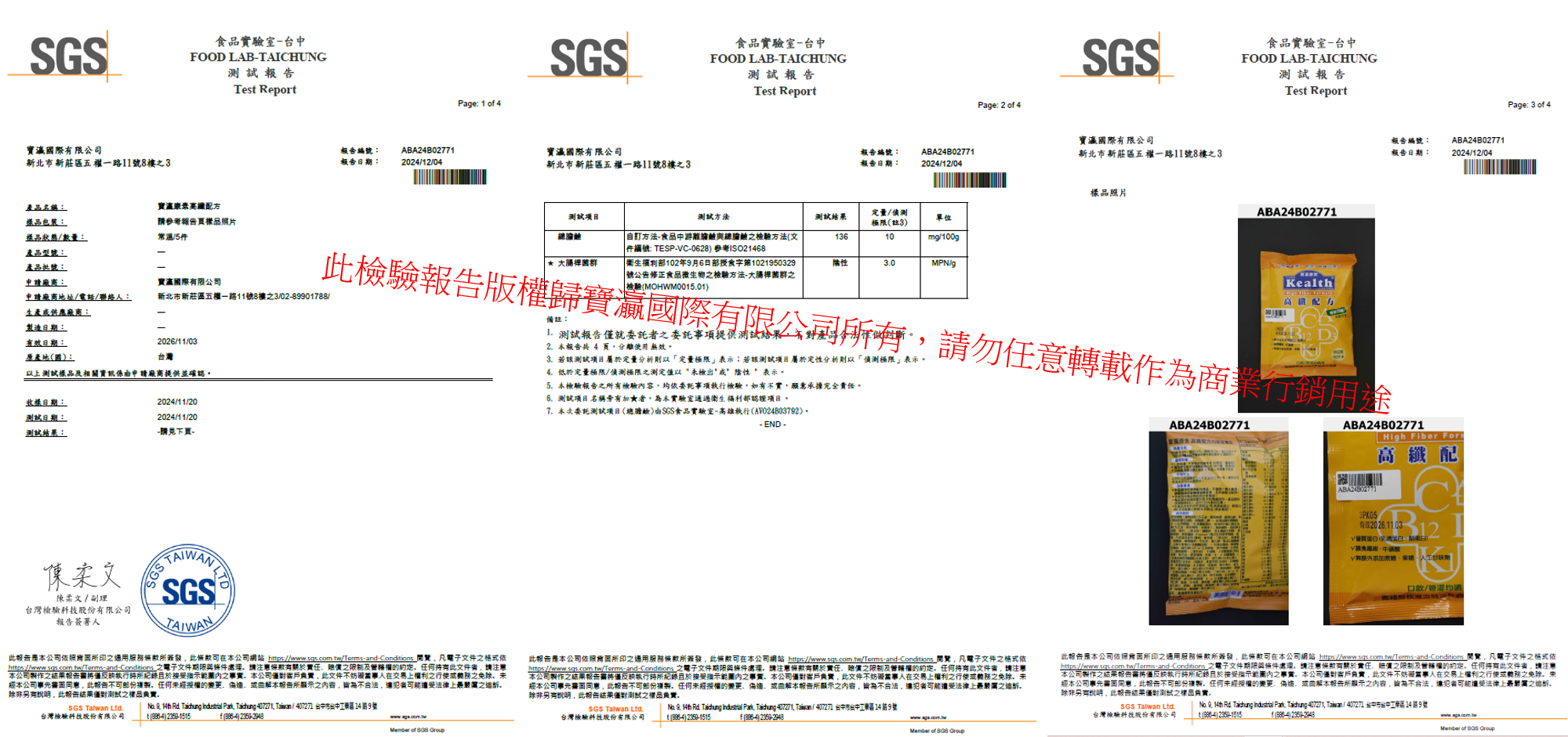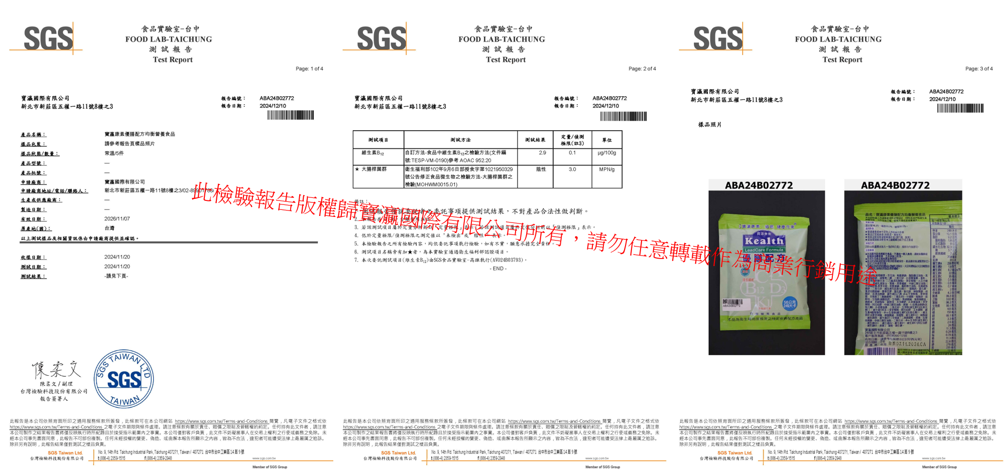 寶灜國際有限公司所有產品皆通過國家規範衛生安全標準,定期自行送至食品工業發展研究所、SGS等機構檢驗,並投保產品責任保險